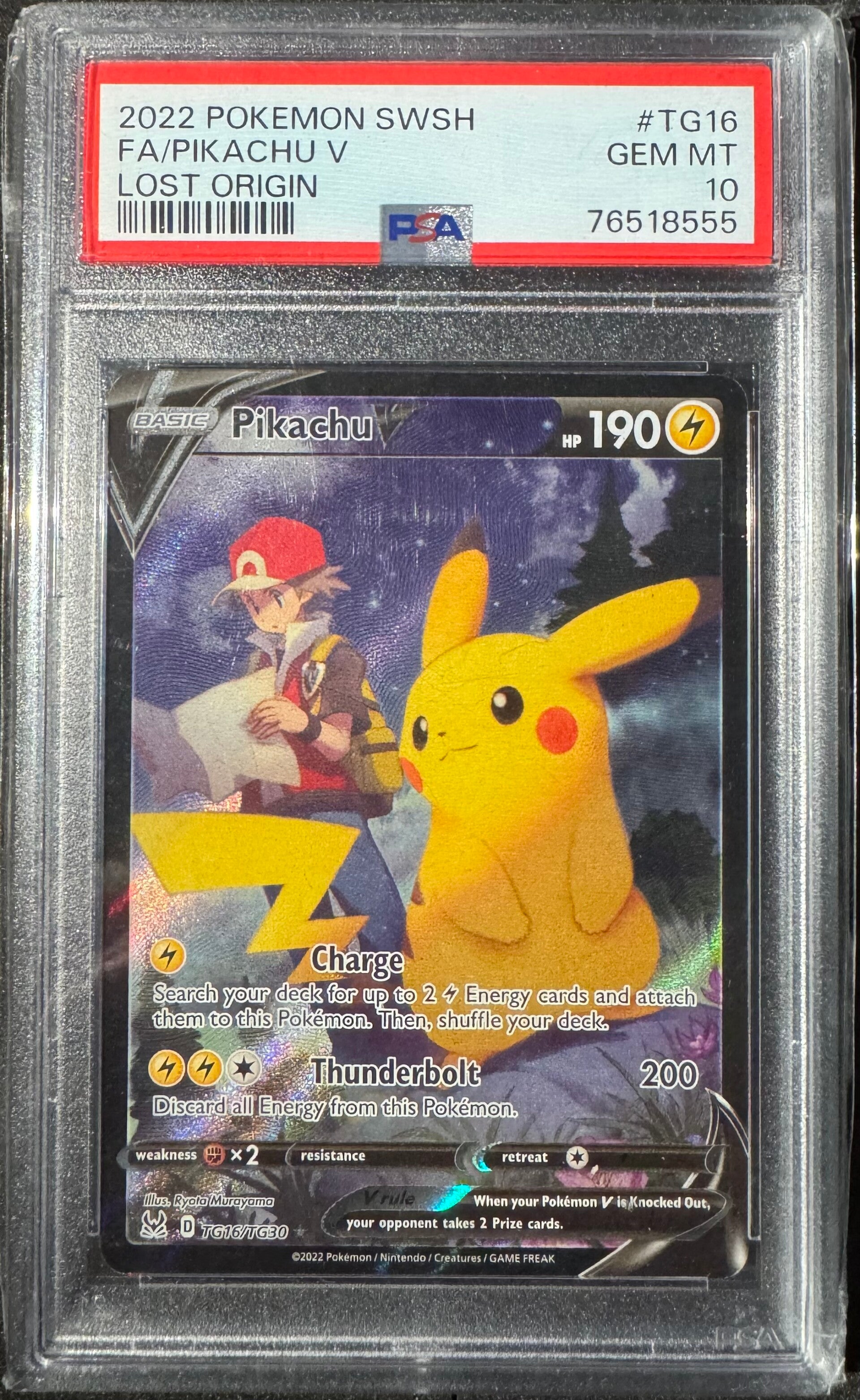 Voor de echte Pokémon TCG liefhebber: deze prachtige Pikachu V uit de Lost Origin Trainer Gallery (kaartnummer TG16) is professioneel gegradeerd door PSA en heeft de hoogste beoordeling die er bij PSA te krijgen is: Gem Mint 10.